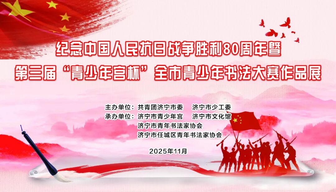 今年是中国人民抗日战争暨世界反法西斯战争胜利80周年。为铭记历史、缅怀先烈,弘扬伟大的抗战精神,展现中华书法艺术魅力,第三届“青少年宫杯”全市青少年书法大赛作品展今天在我馆开幕。本次大赛由共青团济宁市委、济宁市少工委主办,济宁市青少年宫、济宁市文化馆、济宁市青年书法家协会、任城区青年书法家协会共同承办。活动6月23日启动,截至9月31日,本次大赛共收到来自全市青少年书法作品4348件,涵盖楷书、行书、隶书、篆书、草书等多种书体,充分展现了我市青少年书法教育的普及成果。经过评委团专业评审,最终740幅作品脱颖而出,其中获奖作品40件(软笔20件,硬笔20件)、入展作品166件(软笔83件,硬笔83件)、入选作品534个(软笔244件,硬笔290件),评选出优秀组织奖33个。作品创作题材突出铭记历史,缅怀先烈,弘扬伟大抗战精神主题,或讴歌祖国山河,或书写经典诗词,笔里间洋溢着青春气息与文化自信,既传承经典笔墨神韵,又融入当代审美意趣,或意趣通达、温文细腻,或厚拙苍劲、恣肆跌宕,全面展现了当代书法艺术的多元风貌,体现了“书画歌盛世,翰墨播和谐的时代精神。